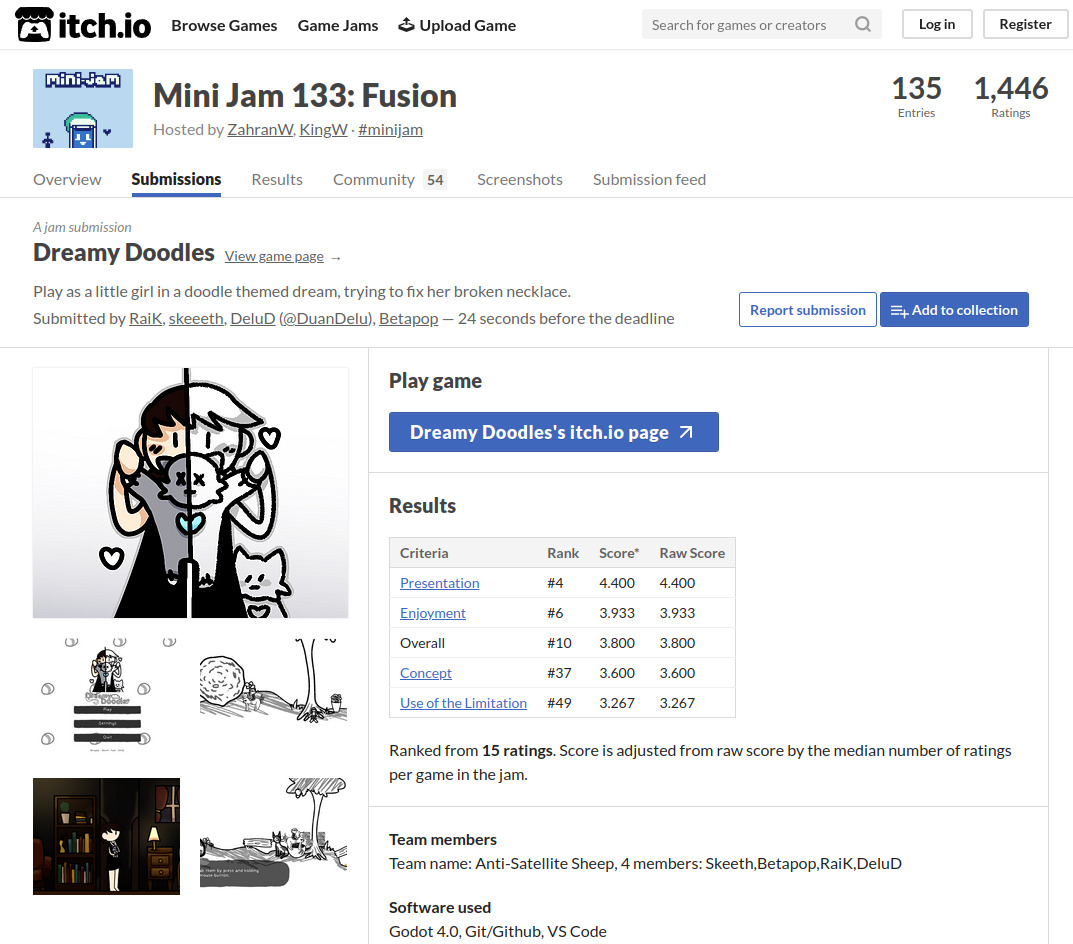In the end, we emerged triumphant, securing a respectable 15th place out of over a hundred submissions! For a team of first-time jammers, it was a moment of sheer elation, a testament to our combined efforts and the boundless possibilities of collaborative creation.Results here.